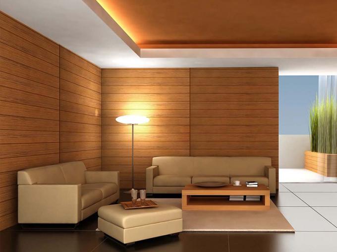 اتاق نشیمن در عکس با پانل های پی وی سی چند لایه چوب تزئینی است، به نظر می رسد مانند چوب واقعی، اما هزینه بسیار ارزان تر و آسان تر از چوب نصب است. همچنین تمیز کردن آن آسان است.
